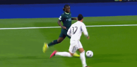 第17分钟,拼抢激烈,罗德里戈在尼科和B席包夹防守下倒地